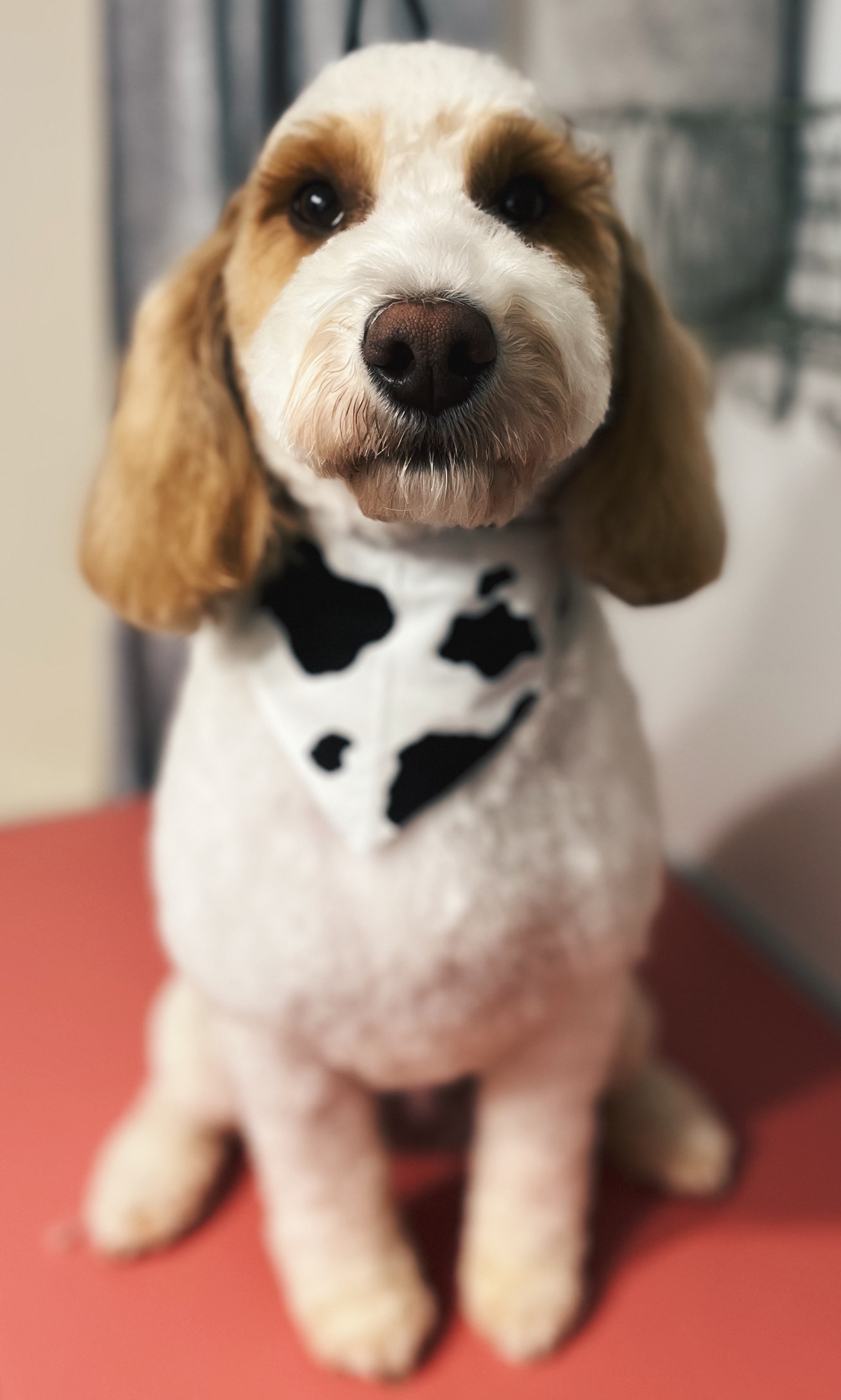 Baths and haircuts include nail trim, gland expression, cologne, and a bandana. Dogs receiving haircuts should stay on a regular grooming schedule for a healthy coat.